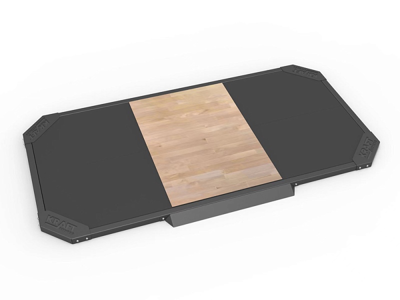 Комбинированная рабочая поверхность: износостойкая резина и деревянная вставка в центральной части. Резиновое покрытие эффективно гасит ударную нагрузку, снижает уровень шума и защищает напольное покрытие, а высококачественная шлифованная фанера создает жесткую и устойчивую поверхность для выполнения упражнений.